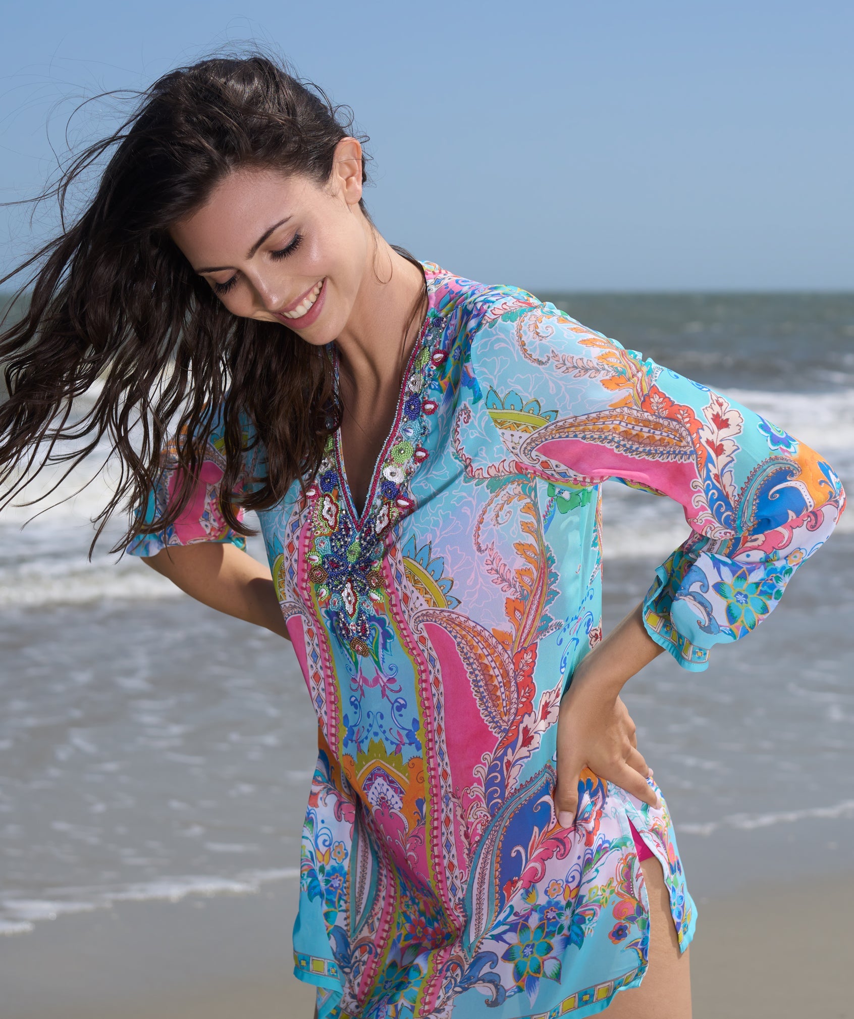 Add a touch of glamour to your beach or poolside look with our Cancun Cover up in Blue. The stunning blue tile print and sparkling embellished beading make it a standout piece. The lightweight, crease-free fabric ensures comfort and convenience, while the midi length adds an elegant touch. With its V neck design, it's the perfect summer cover up for any fashion enthusiast.
