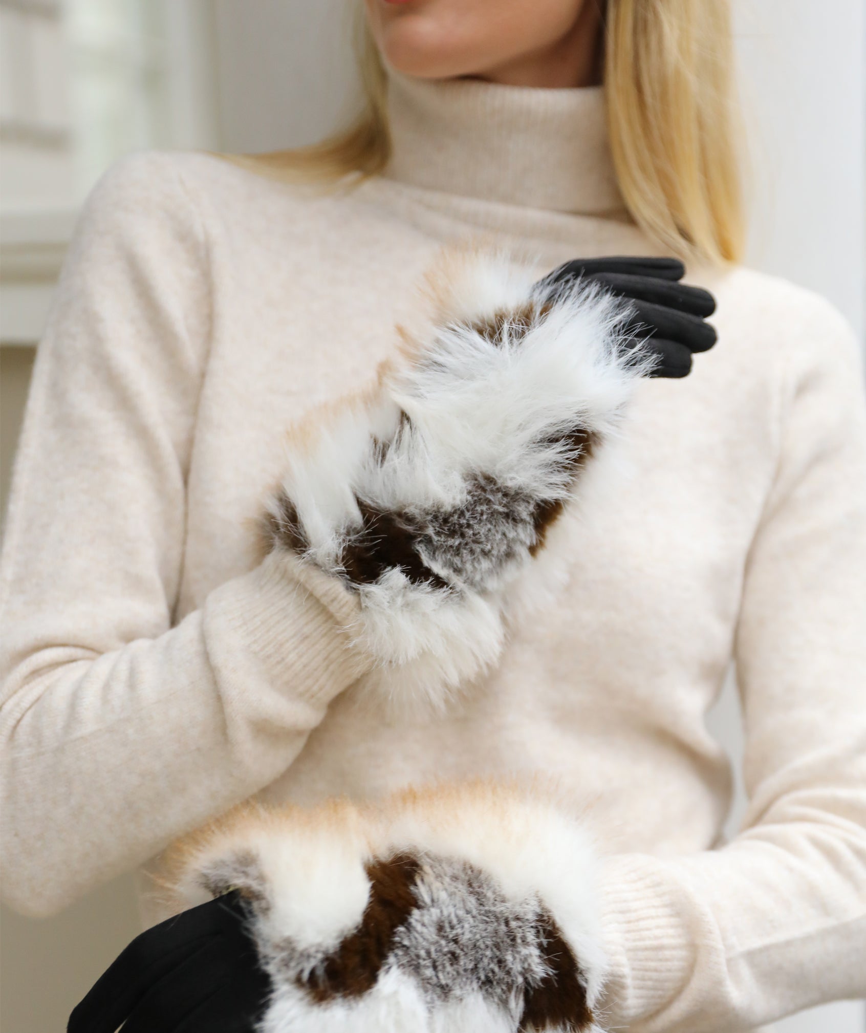 These gloves are crafted from a smooth, soft-touch fabric and finished with a plush faux fur cuff for a refined look. The cuff features a mixed faux fur texture in natural tonal variations, adding depth and visual interest. Designed with a clean silhouette and premium detailing, they offer a polished and elevated accessory finish.