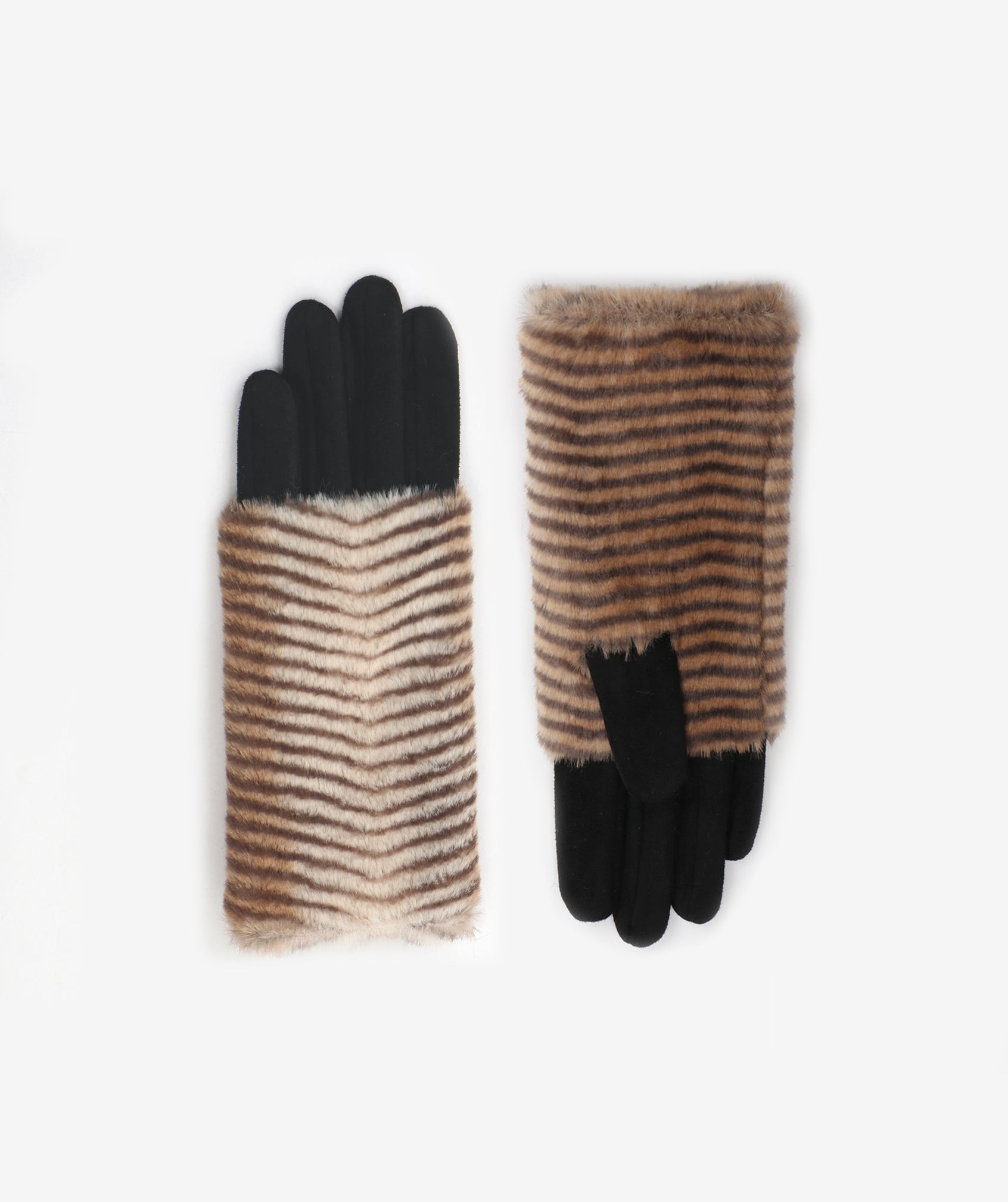 These gloves are crafted from a smooth, soft-touch fabric and finished with a plush faux fur cuff for a refined look. The cuff features a mixed faux fur texture in natural tonal variations, adding depth and visual interest. Designed with a clean silhouette and premium detailing, they offer a polished and elevated accessory finish.