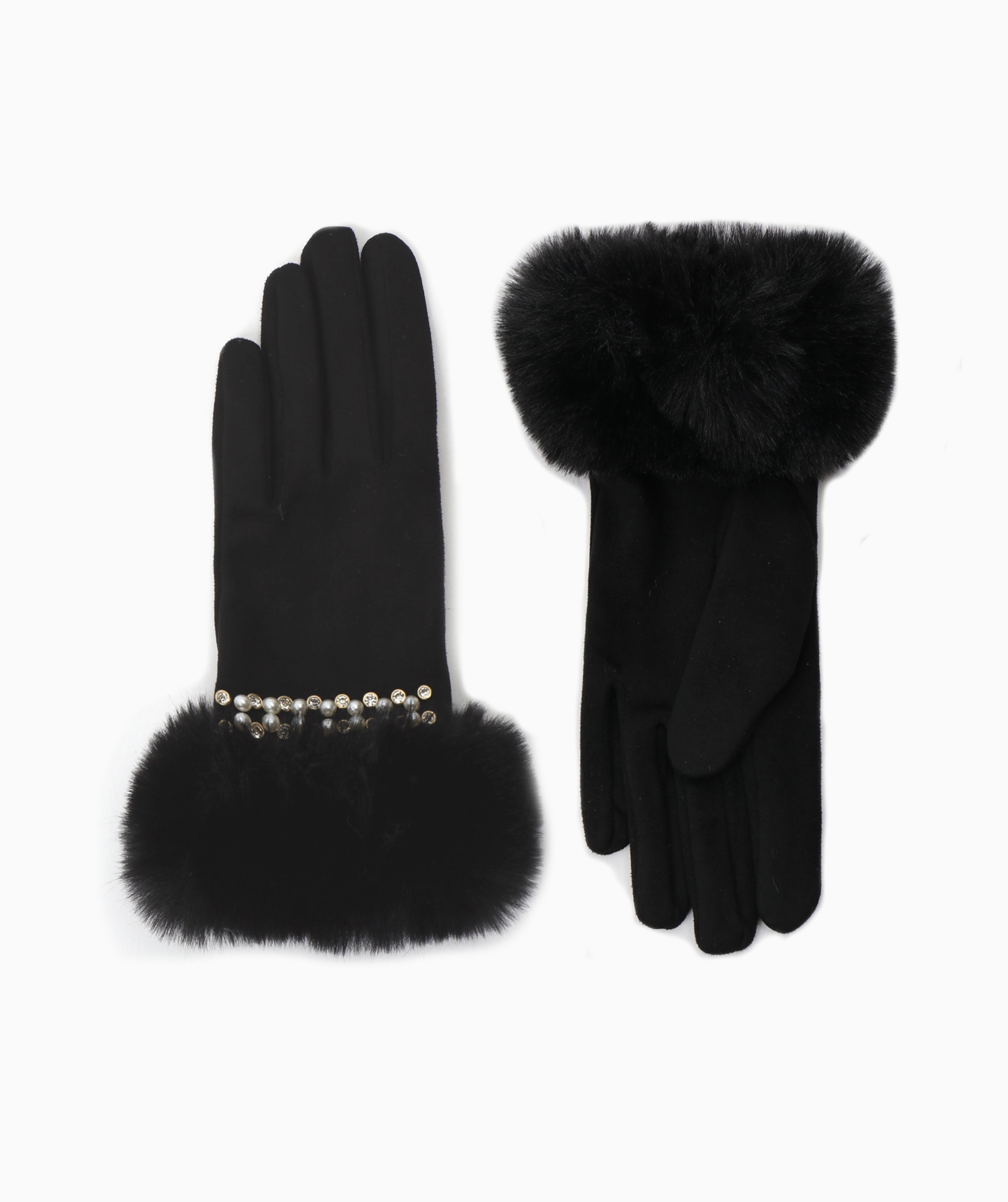 These black gloves are crafted from a soft, smooth fabric for a comfortable and refined fit. Finished with a plush faux fur cuff, they feature a subtle pearl and crystal embellishment at the wrist for an elegant touch. The clean silhouette and polished detailing create a timeless accessory with a premium look and feel.