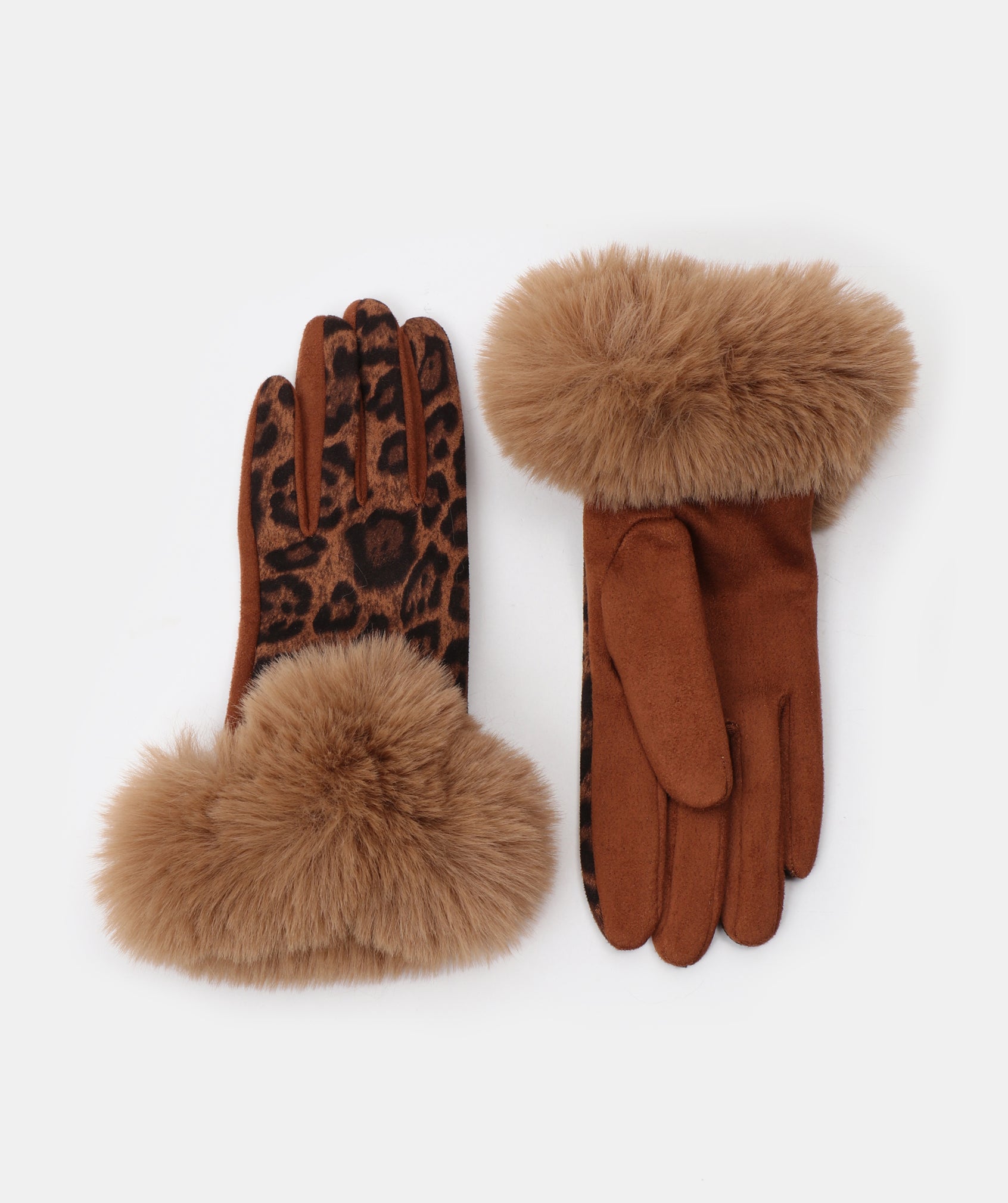 The Leo Glove is a modern statement style crafted with a soft brushed finish and finished with a plush faux fur cuff. Designed with a subtle leopard print panel on the back of the hand, it introduces an understated touch of animal pattern in tonal camel, brown, and black. The faux suede palm is finished in a deeper camel shade, creating gentle contrast and a premium look. Combining texture, warmth, and contemporary detailing, this glove offers a confident yet refined addition to seasonal collections.