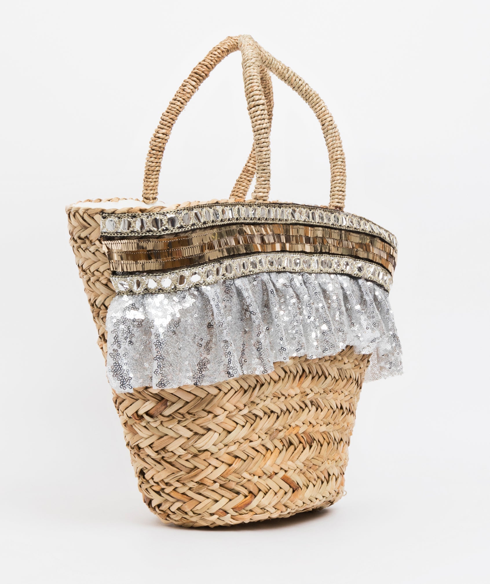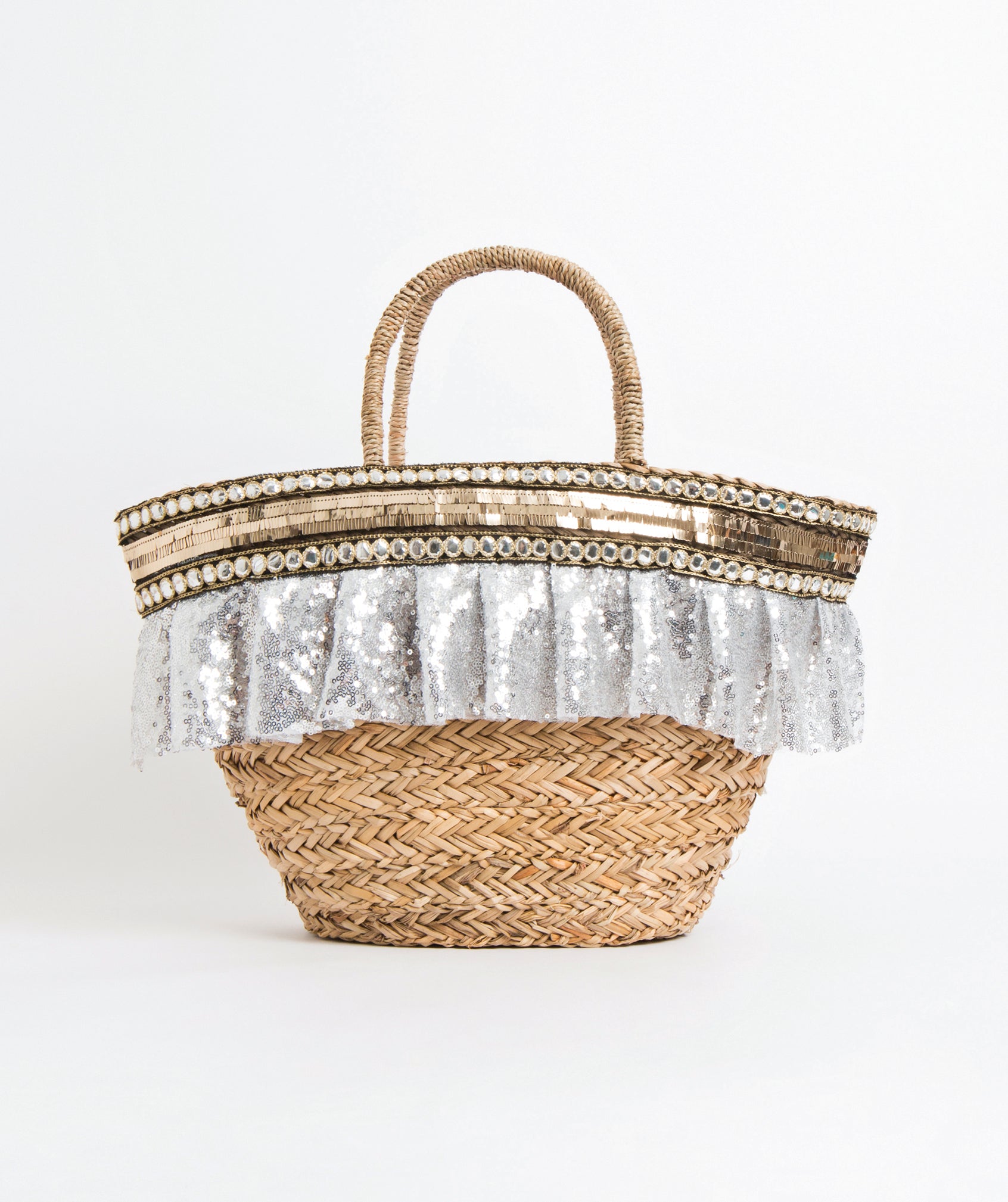 La cesta de playa Bella de paja natural/plateada no es el típico bolso de playa. Con adornos metálicos bicolor y un ribete fluido, realzará tu look de día y de noche. Te encantarán las brillantes lentejuelas doradas del borde superior de esta cesta. Bordeadas con cintas circulares de lentejuelas plateadas, realzarán la belleza de esta cesta tejida 100% de junco marino. El velo corto y brillante de color plata debajo del borde deslumbrará y brillará bajo el sol de verano. Si buscas espacio, este bolso de playa totalmente forrado es perfecto para ti. Con un bolsillo interior y cierre de cremallera, ya no tendrás que preocuparte por perder tus objetos más preciados.