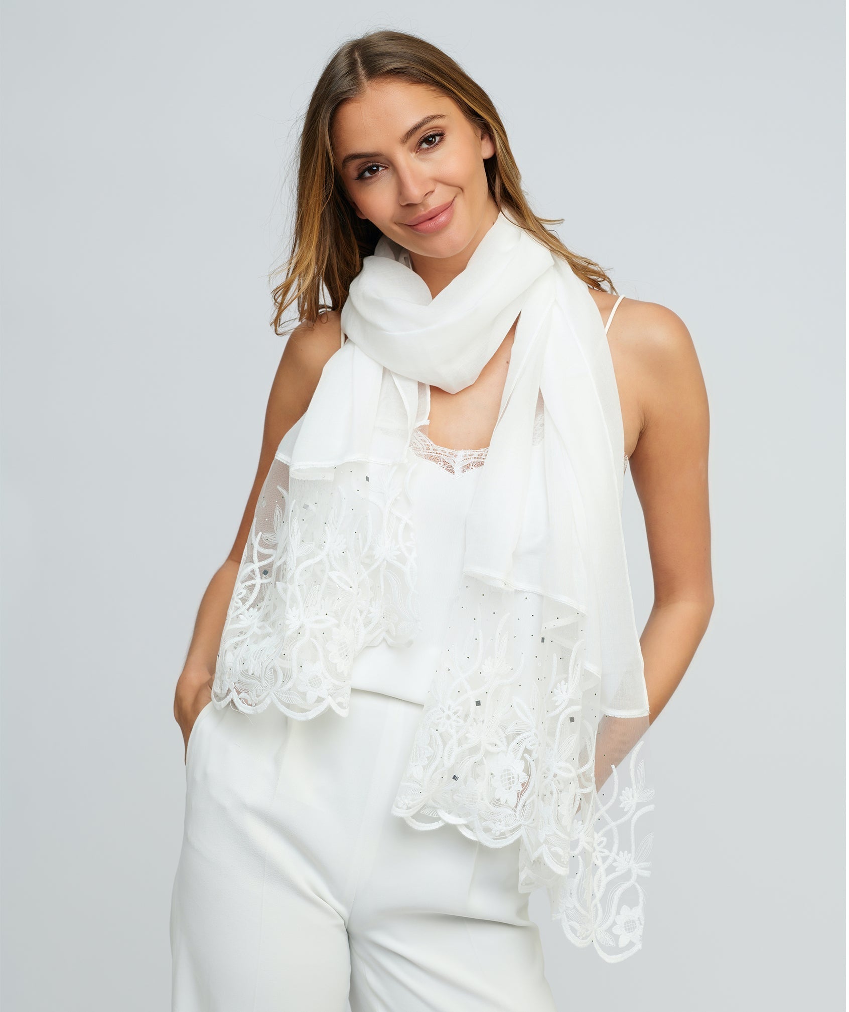 Si vas a celebrar una boda en la playa, no busques más que esta elegante pieza para añadir a tu atuendo nupcial. Impecable, de un blanco impecable y confeccionada en una tela ligera y transparente, Larissa tiene un tacto sedoso. Un dobladillo con borde de encaje festoneado adorna los extremos de esta bufanda y luce delicadas cuentas por todas partes.