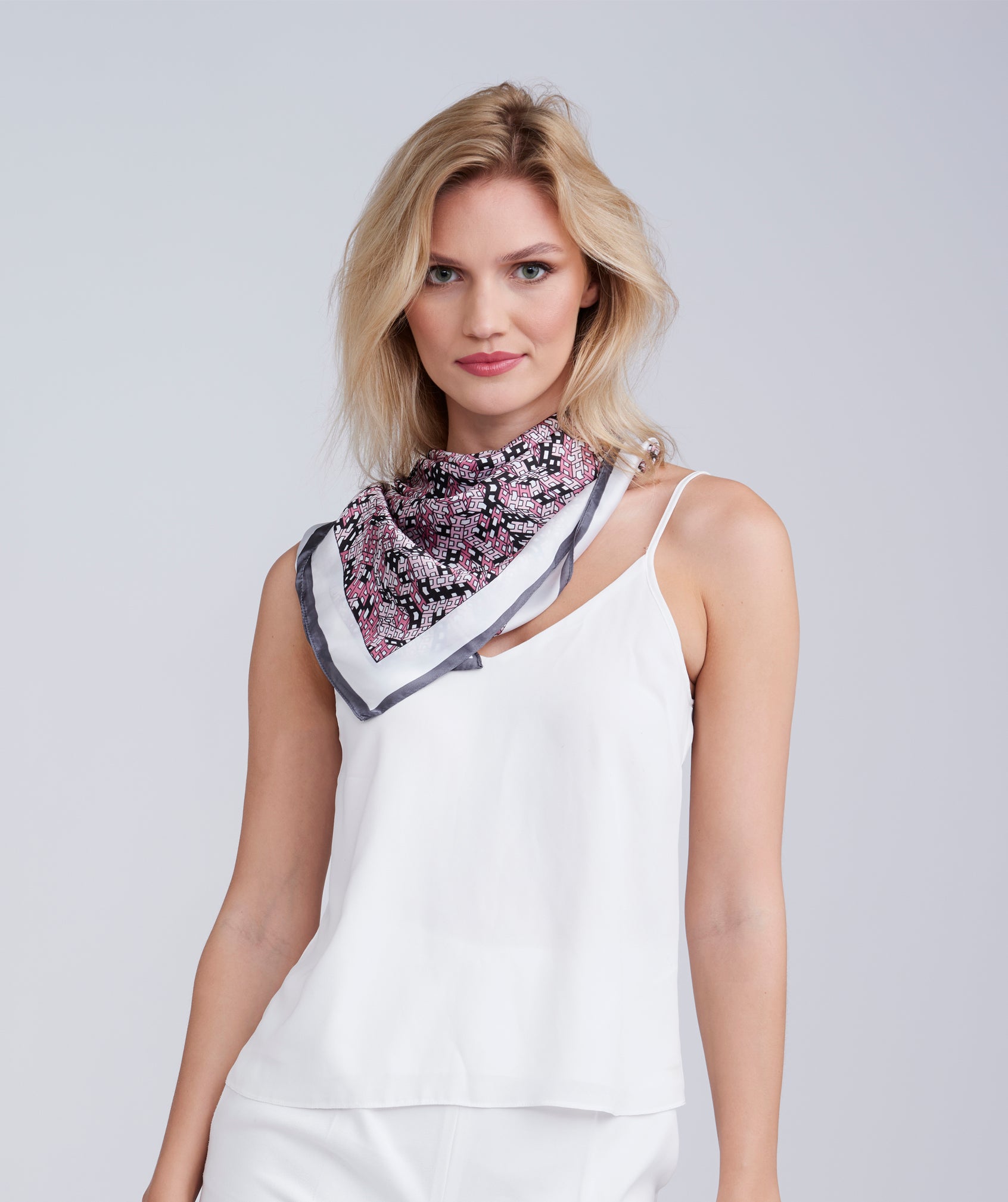 El pañuelo cuadrado de satén estampado Luna es un clásico pañuelo veraniego neutro con forma cuadrada y un estampado detallado. Un ribete plateado y blanco envuelve el pequeño pero detallado estampado abstracto en esta tela de acabado sedoso. Llévalo sobre el cabello, anudado al cuello o incluso alrededor de las asas de tu bolso de playa para un toque de glamour.